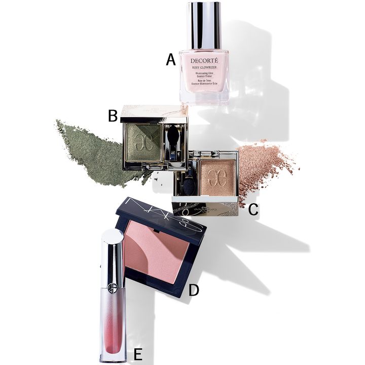 A.みずみずしいツヤをプラス。5点置きしてのばし、トーンアップ&艶やかに。ロージー グロウライザー + SPF15/PA++ 30ml ¥4,950(コスメデコルテ)>