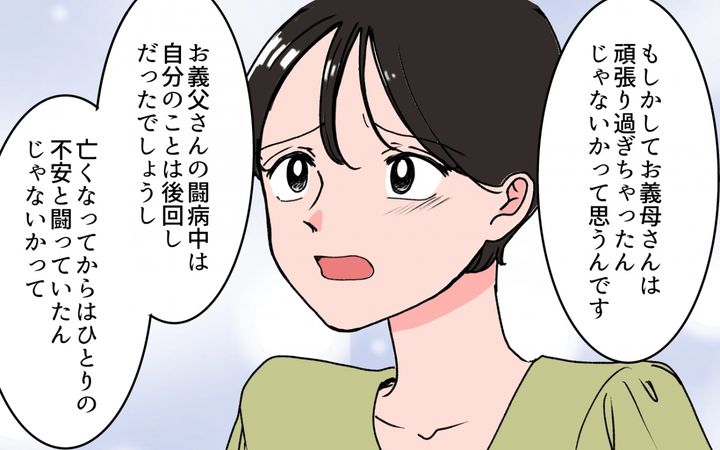 お義父さんが亡くなって以来、実の子である夫たちからの連絡も途絶え、ずっと孤独だったと…。その告白に、夫と義妹は言葉を失いました。義母はたった一人で不安や孤独と闘い続け、心が消耗していってしまったのかもしれません。