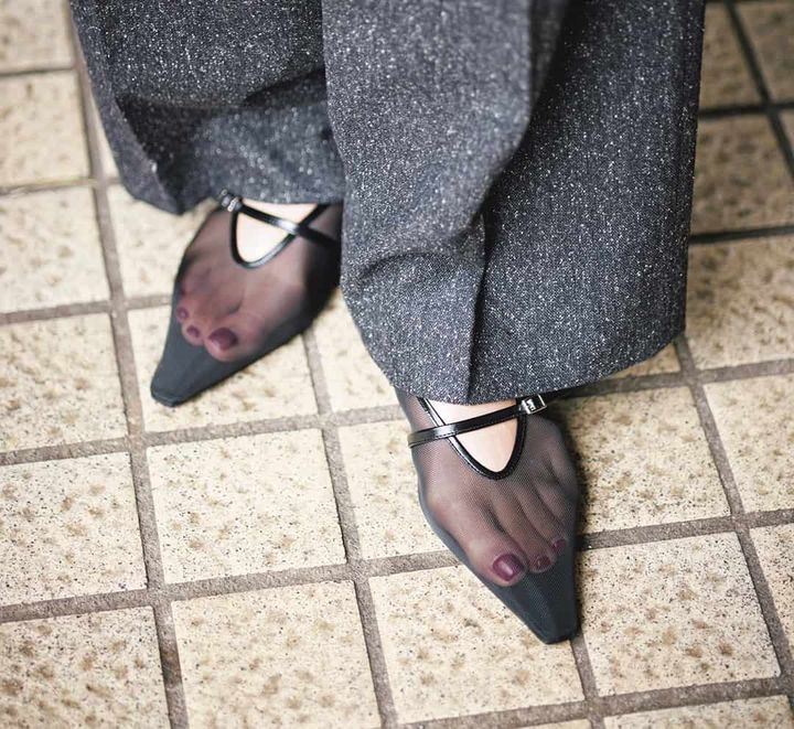 ペプラム型が女性らしいジレセットアップには、とんがりフォルムが女っぽい靴を合わせるとうまくまとまります。透け感のあるシューズでこの時期にちょうどいい軽さもプラスして。