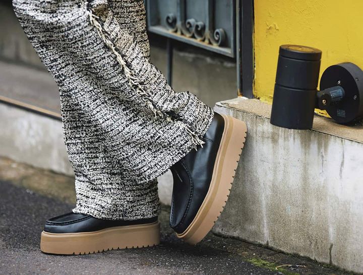 クラシックで落ち着いた雰囲気のあるツイード素材には、カジュアル感が強い靴を合わせるのが老け見えしないコツ。重めな生地を受け止めてくれるボリュームソールがバランス 良く仕上がるポイントです。