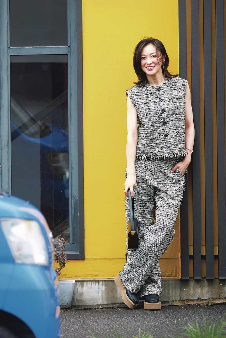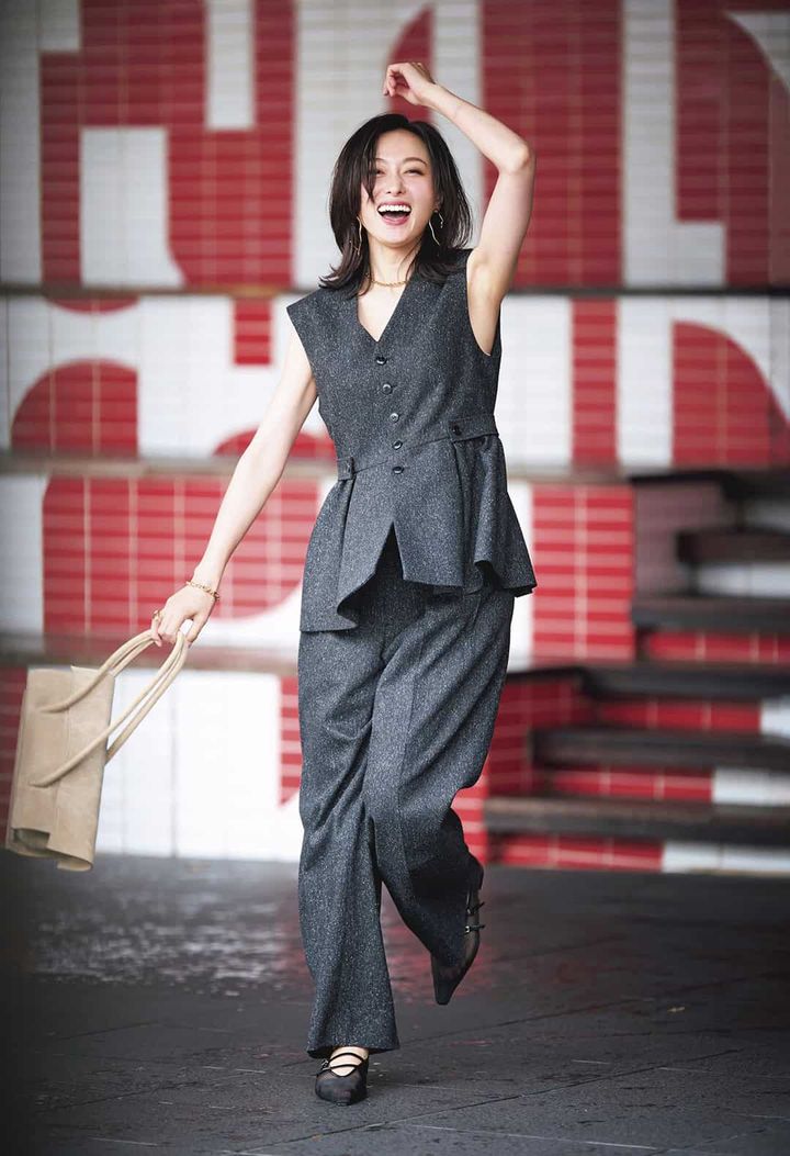 ジレ¥66,000パ ンツ¥66,000(ともにデパリエ)バッグ¥79,200(マエストソ/アマン)靴¥33,000(カ ミナンド/グラビテート)ピアス¥35,200(シャルロット ウーニング/フラッパーズ)バングル¥46,200(シーエックスシー/アマン)