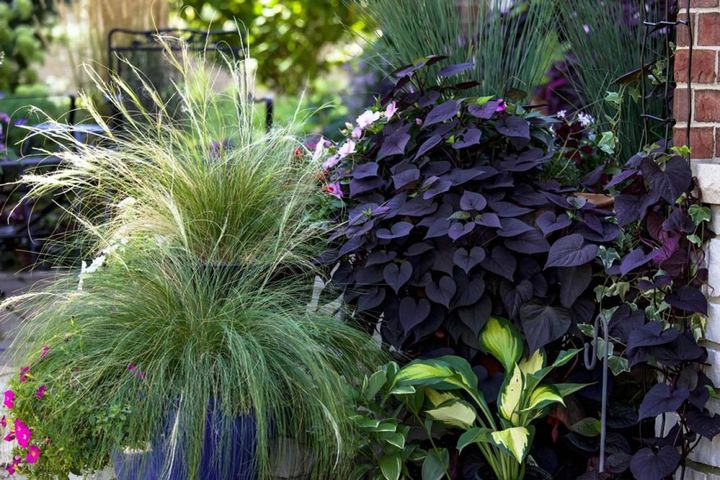 草丈が大きめのものは花壇の後方へ、低いものは手前の縁取りに使うのが一般的ですが、庭の核として常緑のグラスを配置して花と合わせるのもすてきです。下の写真はグラスのスティパを2段に重ねた鉢植えで高さを出し、紫色のイポメアやギボウシなどの葉もの、ピンクのペチュニアなどと組み合わせたコーナー。花や形の異なる葉ものをつないでいます。
