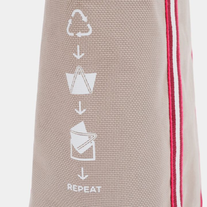 上品なベージュを基調とし、持ち手はボルドーレッドとビビットなピンクのラインがアクセント。ランチトートサイズで、ちょっとしたお出かけにぴったりです♪ 10年使える耐久性を唱っているだけあって生地感もしっかりしていて、長く相棒になってくれそうな予感♡