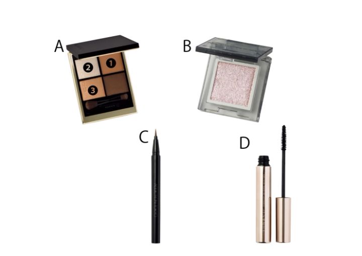 上まぶたは【A】❶のベージュ1色でシンプルに。涙袋はまずベースに【A】❷の明るいパールをのせ、【B】の偏光ラメを重ねてアクセント。【A】❸でさりげなく影をつけて立体的に。【C】でインラインだけ引き、まつ毛には【D】をササッと軽く。