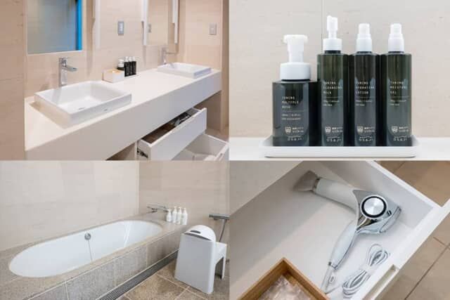 洗面はゆとりたっぷりのダブルベイシン。ドライヤーはリファ、スキンケア用品はヒノキやホーウッドなど森林の香りが心地よい「 OSAJI 」でそろえているのも嬉しいポイントです。
