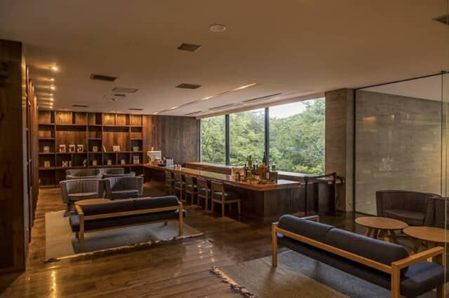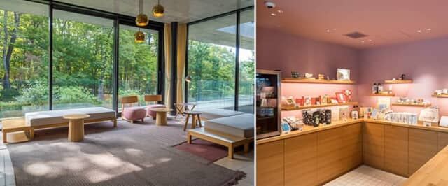 ロビーの広い窓からは那須の森を見渡せます。レセプションのすぐ横には、那須の銘品やホテルのオリジナル商品が並ぶショップもありました。