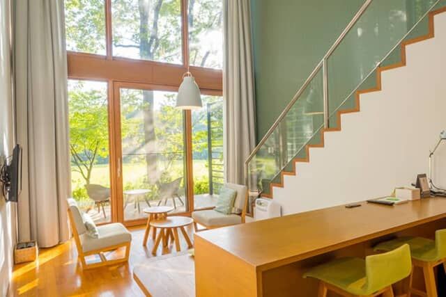 窓に向いたカウンターからは、コーヒーやドリンクを楽しみながら、吹き抜けになっている高い窓を通して景色を満喫。アクセントウォールや椅子、小上がりのソファーベッドなどに緑色を使い、自然との調和が感じられる客室です。