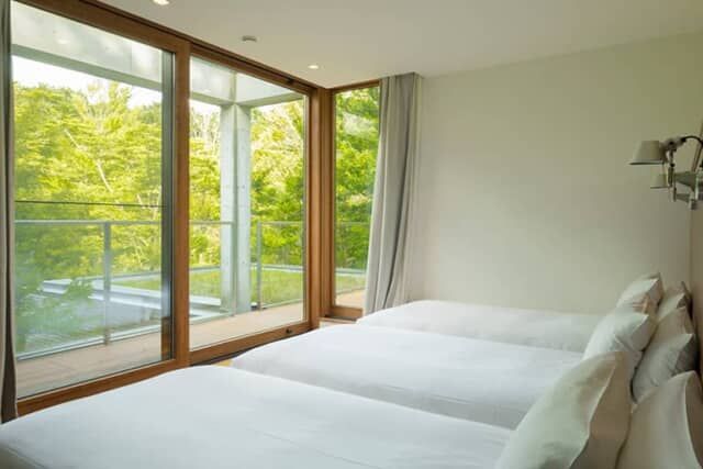 緑に隠れるようにしたたずむRC建築の本館は、木のルーバーに囲まれていて周囲の自然と一体となる外観。40平米以上の「本館プレミアテラス」は3名まで、62平米の「本館デラックスメゾネット」は4名まで宿泊できます。