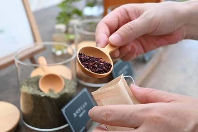 ハイビスカスやレモングラス、ルイボスなど4種類用意されたハーブをブレンドしてティーバッグに詰め、オリジナルのハーブティーを作れます。「グリーンハウス」でも飲めますが、客室に持ち帰って飲むこともできます。