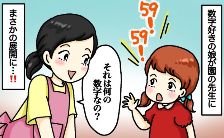 次の日、娘を保育園に送っていくと先生に向かって走って行きました。前日の出来事を忘れていた私は、にこにこ見守っていたのですが……。娘が保育園の先生に「59! 59!」と言っているのです。先生が「59って何?」と言い、ハッとなりました。