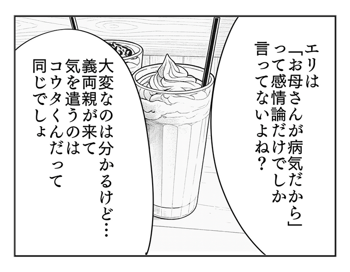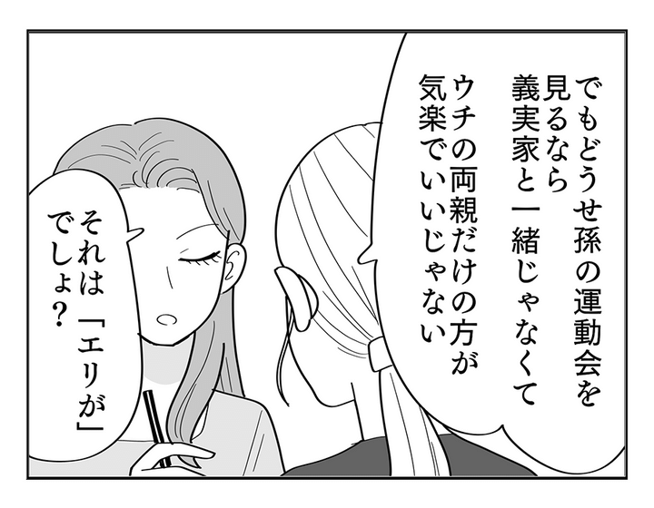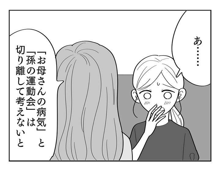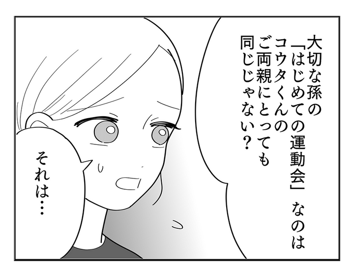 エリさんは夫のコウタさんと息子のアオトくんと暮らしています。アオトくんがはじめての運動会を控えるなか、実家のお母さんに大きな病気が見つかりました。大切なお母さんに気兼ねなく運動会を楽しんでほしくて、今回はどうしても義両親には遠慮してもらいたいエリさん。両方招けばいいと言うコウタさんとは口論になってしまいます。しかし友人のマナミさんは「エリが義両親に来てほしくないだけでしょ」と指摘し……。