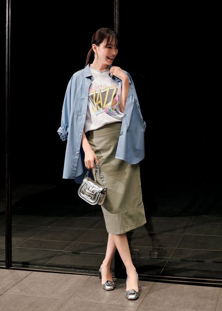 主張のあるロックTも、ブルーシャツを羽織って大人の落ち着きをプラス。タイトスカートときれいめ小物を合わせて、残暑にも対応しつつも女っぽさが香る着こなしに。