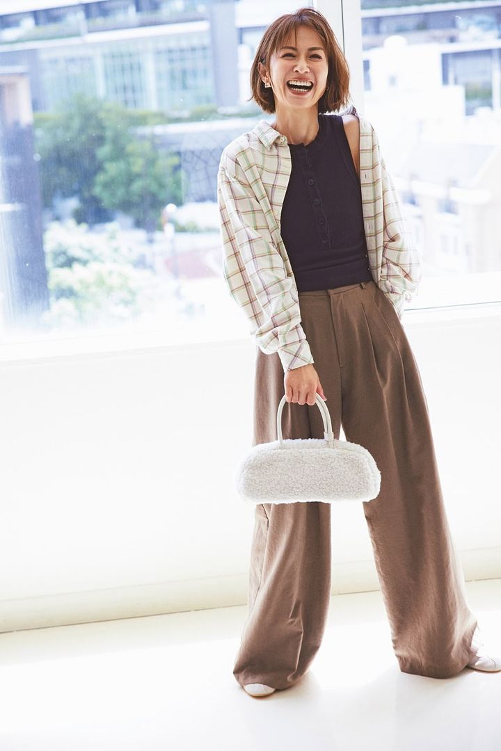ラフに羽織ったチェック柄シャツが、ノースリの肌見せを程よくカバーし、冷房や朝晩の肌寒さに◎。スエード調のワイドパンツと合わせれば、秋らしさと大人の余裕を兼ね備えた休日スタイルに。