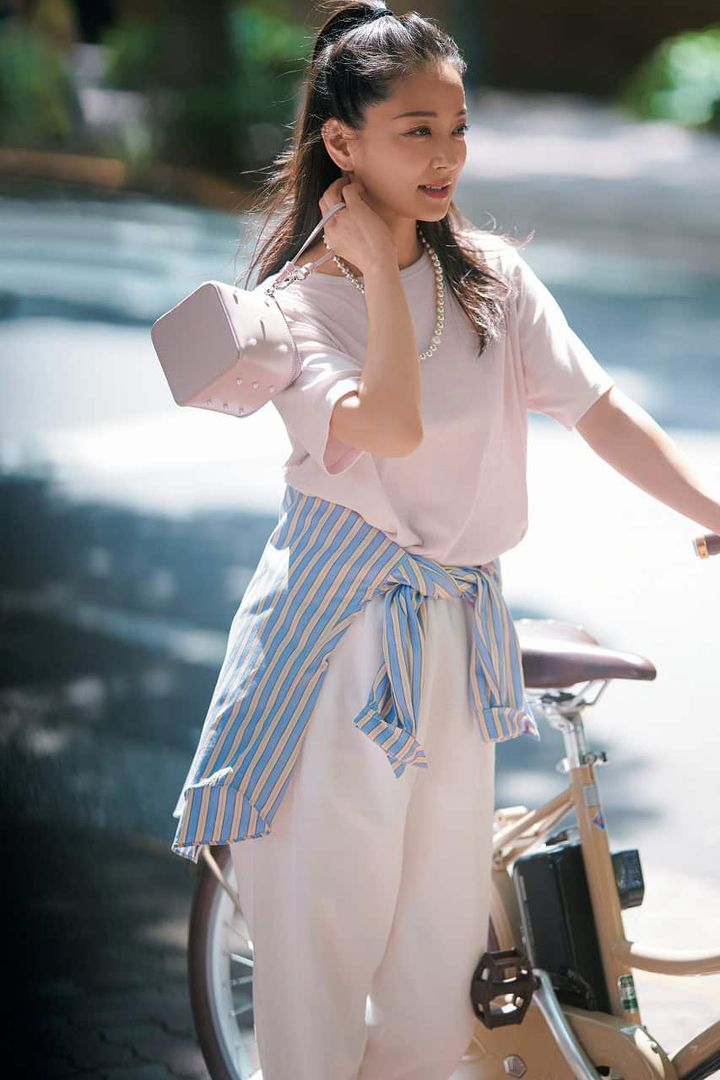 ゆったりしたサイジングの長袖シャツは、自転車などアクティブな日も動きやすく快適。カラーストライプなどアクセントになる色柄なら、腰巻きした時にはまた新しい表情のスタイリングに!温度調整必須な日におすすめのスタイルです。動きやすい白パンツ合わせで清潔感もキープ。