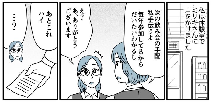 私はアイ(28)。結婚して夫と2人暮らしです。職場ではリーダーという名の雑用係があります。今年引き受けたミサキさんのことを、私はバカなお人好しだと見下していました。けれど役割分担させられそうになるたび逃げつづけていたら、ミサキさんに怒られました。私は優しくしたら搾取される、母のような生き方をしたくなかったのです。ただ年老いた両親は変わりました。誰かのせいにしていたら幸せになれない……。だから私も変わることにしたのです。