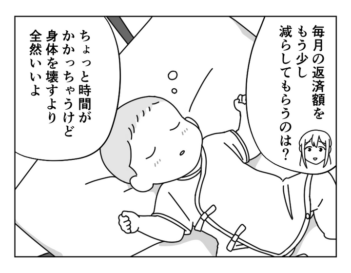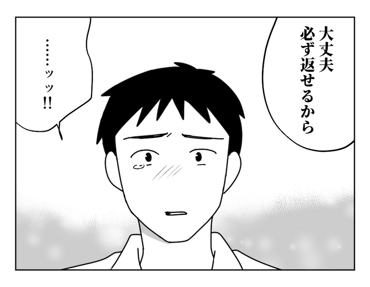 ケイシさんは妹・ミズキさんの夫に150万円借りていますが、妻・エリナさんにその事実を伝えずに結婚しました。しかし最近子どもができたことで予想以上にお金がかかり、返済ができていません。しびれを切らしたミズキさんに詰め寄られ、ケイシさんは今後の返済計画などをきちんと書面に残すことに。ケイシさんはおこづかいを返済に充て、節約や土日のバイトで、返済額・月3万円の捻出を頑張ります。しかし結果倒れてしまい、エリナさんに借金を告白したのでした。