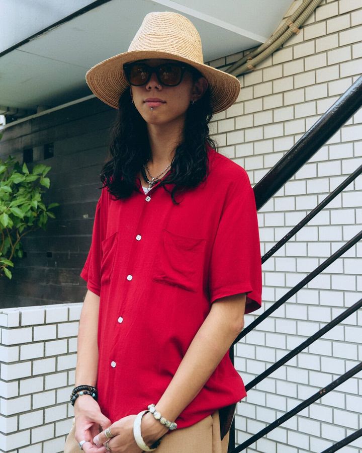 【スナップ】真紅のオープンカラーシャツとベージュのワイドパンツ…独特の生地感により生まれたシルエットが洒脱なムード