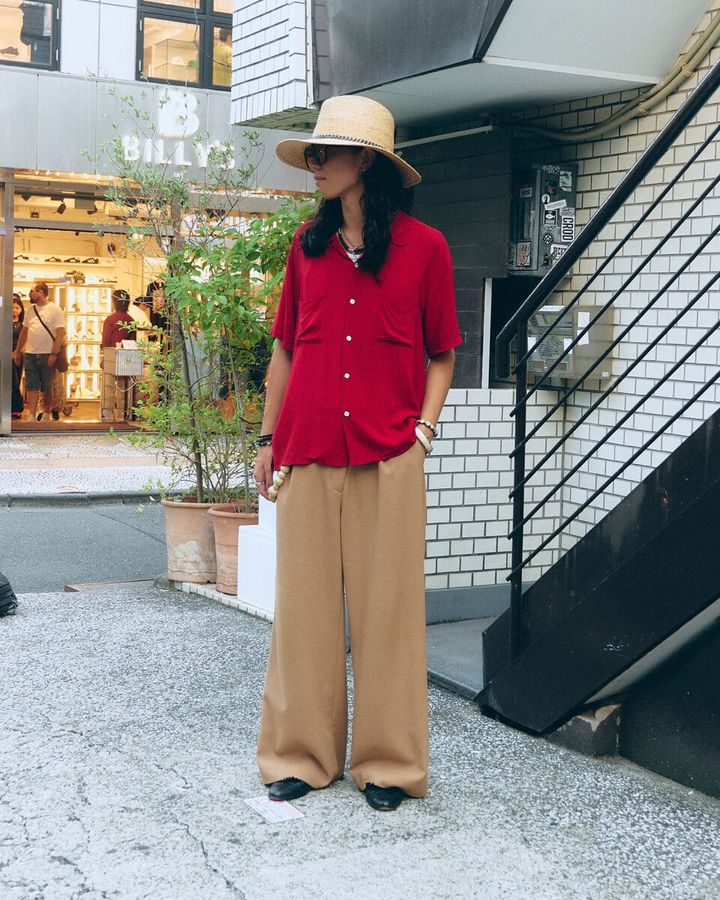 3. 【スナップ】真紅のオープンカラーシャツとベージュのワイドパンツ…独特の生地感により生まれたシルエットが洒脱なムード