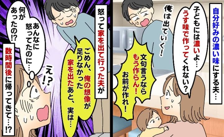 先日の休みに、いつものように昼ごはんを作ってくれた夫。案の定こってりな濃い味で作っていたので、食後に「おいしいけど、私はもうちょっと薄味でもいいと思うな。そうしたら子ども用に取り分けなくてもいいし……」と夫にやんわり指摘。すると夫は「作ってもらっているんだから文句言うなよ」と私に怒ってきたのです。私は「子どもに濃い味がよくないって話は前にもしたよね? 子ども用にわざわざ取り分けるのも大変なの。濃い味がいいなら、せめてあとから自分のだけ足すとかじゃダメ?」と言うと、「めんどくさい。そんなふうに言われるならこれから俺は作らない。お前が全部作れよ!」と怒鳴って家を出て行ってしまったのです。