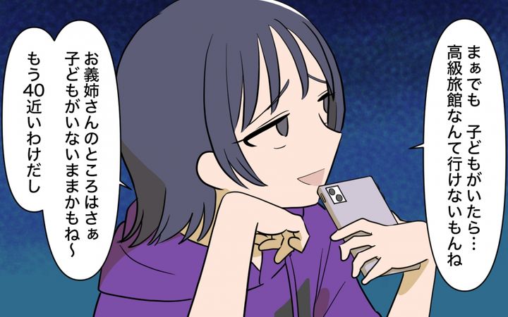 さらに咲は、姉のSNSを見ては「こんな高級旅館に泊まってる」「私たちは安物なのに虚しい」と愚痴をこぼし続ける。挙げ句の果てには、「子どもがいないから高級旅館に行けるんだ」「もう40近いし、子どもがいないままかもね」と、姉のことを勝手に決めつけて見下すようなことを言い出した。