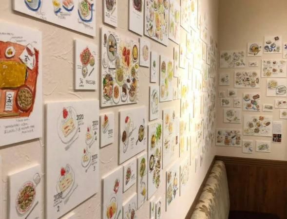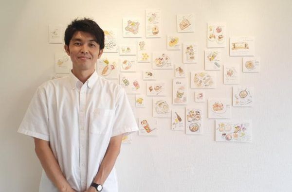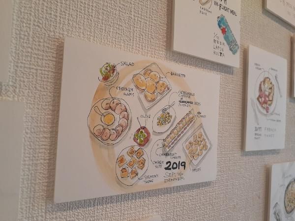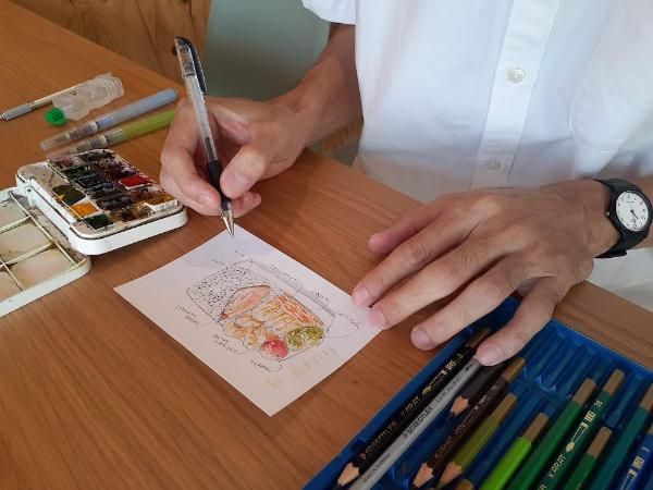 たけださんは、今までに合計3回の個展を開催されていますが、そのいずれも作品のテーマは食べ物。 どんだけ食いしん坊なのか、と思いきや、ご本人は細身な方でした。 今までは、ご自身が食べたものをスケッチしていましたが、今回は初めて友人知人が作ったお弁当を描いてみようと思ったそうです。