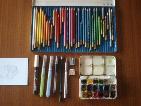 キレイに並べられた道具。茶系の色鉛筆の消費が大きいですね。[/caption]