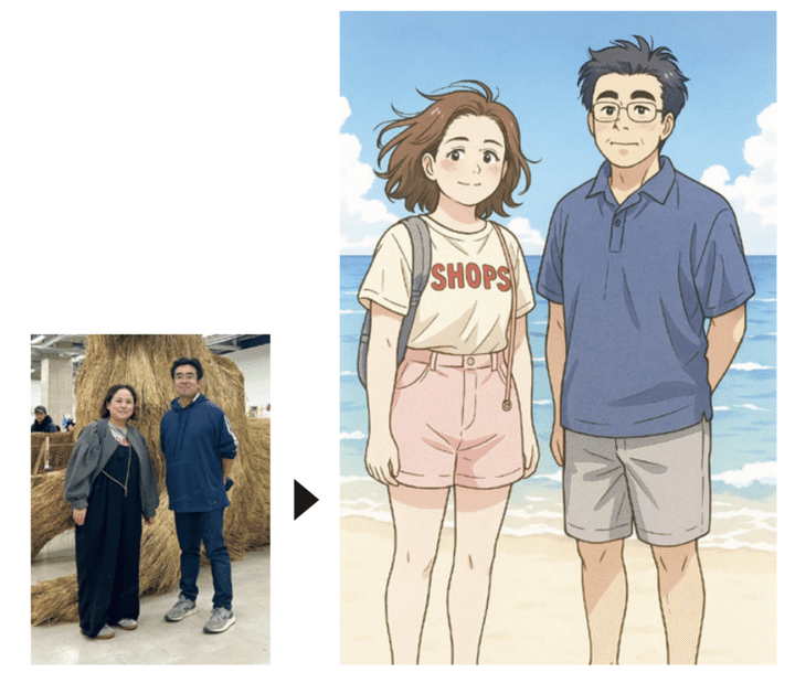 「少女漫画風のイラストにして。服装と背景を夏らしく変更希望」