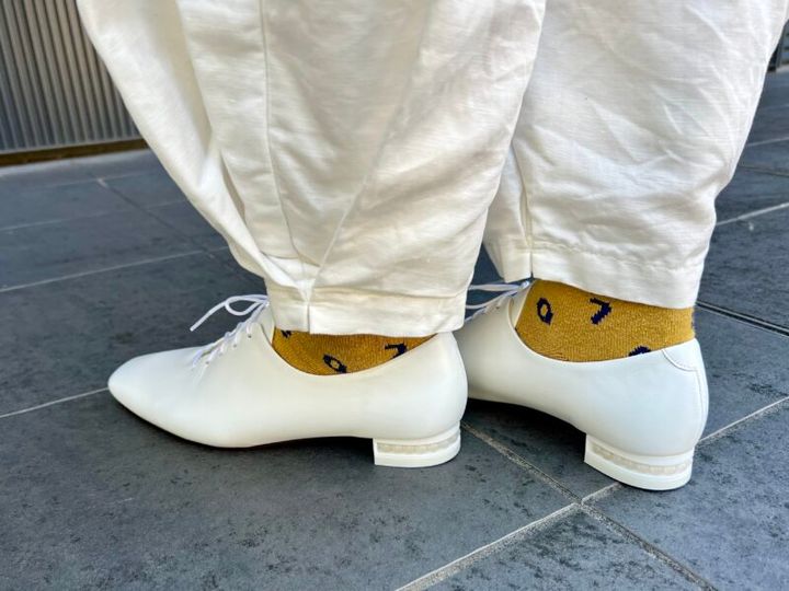 裾がつぼまったシルエットが愛らしい綿麻のパンツに、この秋冬トレンドのレースアップシューズをコーディネート。「かかとに天然石のオニキスが数珠のようにつぶつぶ並べてデザインされているんです」。後ろ姿もぬかりなく!