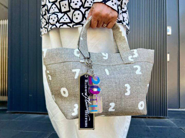 服装を選ばないグレーのバッグに、お気に入りのチャームがふたつ。ひとつは、B'zのコンサート会場で記念に購入したもの。もうひとつはSOU・SOU20周年記念のチャーム。「私も20年働いているので、そう思うとなんだか感慨深いです」。
