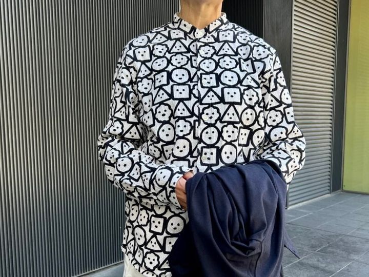 笑顔がたくさん集まった、楽しいデザインのスタンドカラーシャツは「ソウソウ デポルターレ」。「総柄なのでちょっと派手かな?と思われる方も、これからの季節なら、インナーとして使うといいアクセントになるのでぜひチャレンジしてみてください」と石田さんらしいアドバイス。