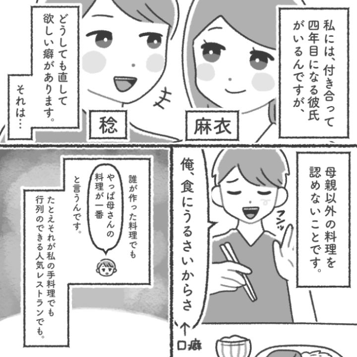 衝撃のエピソードを漫画化!今回はどんな料理に対しても自分の母親の料理を盲信して文句ばかり言う頑固者の彼氏のお話をご紹介します。