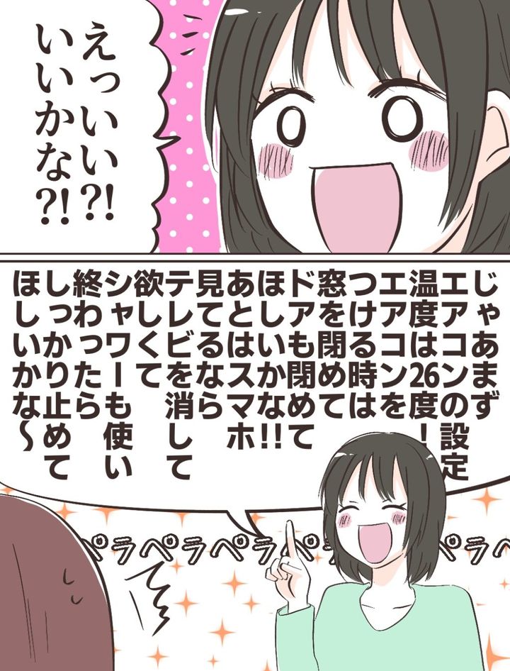 節約に協力してくれると聞いて嬉しくなった私。良かった!これで気兼ねなく今まで通りの節約ができる!そう思って、エアコン設定温度や窓やドアを閉めること、スマホ見てるならテレビ消して欲しいこと、シャワーをしっかり止めて欲しいことなど、気になっていたことを一気に伝えました。そしてふと気づくと。