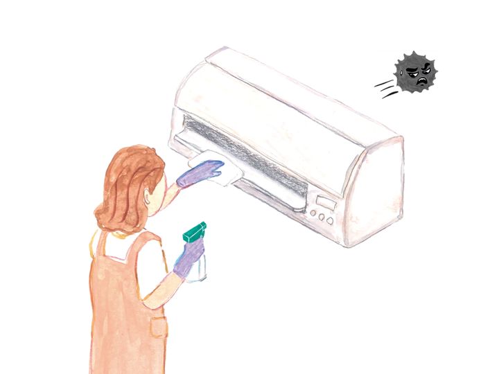 フィルターは掃除機でほこりを吸い取ってから、除菌スプレーを吹きつけたペーパータオルで拭いて殺菌を。吹き出し口(フラップ)も同様に拭き掃除をしましょう。なお、暖房・30℃設定にして1 ~2時間 運転すると、内部の熱交換器やファンが乾燥します。半日以上外出する際、1 ~2時間で切れるようにタイマー設定をしておけば、カビ防止に効果ありです。