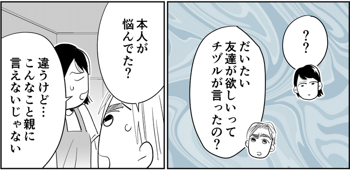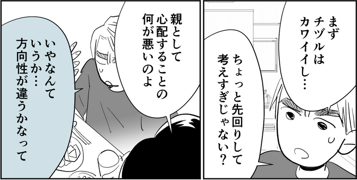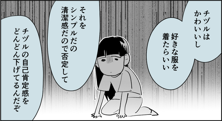 「親が肯定して、チヅルを受け入れなくてどうするんだ?」「俺はチヅルをかわいいと思っているし、好きな服を着たらいいと思っている。でも、チヅルの好きなものを否定して、自分が思う通りの服や髪型にして、そうやって母親が、チヅルの自己肯定感をどんどん下げているってことにどうして気がつかないんだよ」