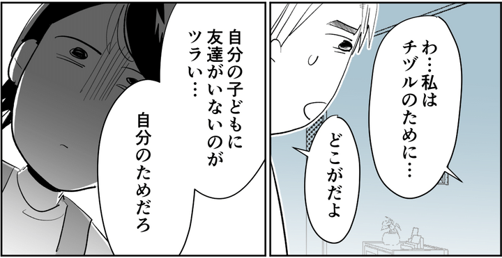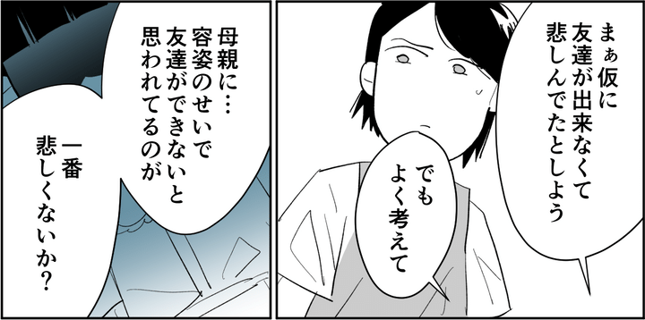 「友達がいなくて寂しかったのも、ルッキズムで悲しい思いをしたのも……全部自分のことだよね?」と旦那に指摘されました。自分の経験をもとにした考えになりすぎていると。そしてチヅルが何より可哀想なのは「容姿のせいで友達ができないと母親に思われていること」だと、旦那はそう言うのでした。