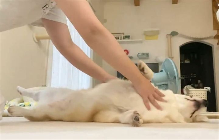 飼い主さんがコネるのを再開すると、さっそく寝転がり直したあんずちゃん。 ご満悦そうなその姿、この後も飼い主さんが手を止めればすぐさま起き上がって再開するようにアピールしてみせるのでした。