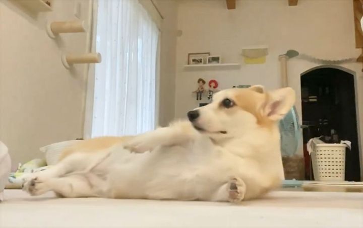 横になり飼い主さんにコネコネしてもらっているコーギー。 しかし、飼い主さんがその手を止めると・・・、すぐさま不満を訴えかけました!