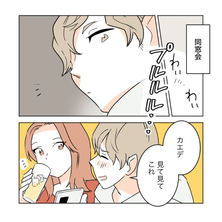 久しぶりに地元に戻ったカエデと話していると、ショウマのスマホが鳴り、ショウマは目を細めてその画像をカエデに見せました。