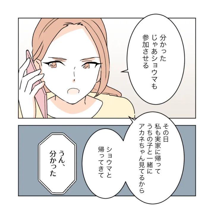 久しぶりに地元に戻ったカエデは、偶然娘アカネが転入したクラスにシズクの娘ミズキがいることを知りました。子ども達は仲が良さそうなので、問題ないだろうと胸をなでおろすカエデ。偶然の再会とともに、自分の帰省で同窓会が開かれることになったことを妹のサクラに報告すると、高校時代にケガをした時にシズクがいつもカバンにつけているヒヨコのぬいぐるみを見たことでまだシズクへの疑いを拭いきれずにいるサクラはとても心配して、現在は夫となったショウマも同窓会に行かせるとカエデに伝えました。「実家に帰ってアカネちゃん見てるから、ショウマと帰ってきて」とサクラが言いました。これが、同窓会の日にショウマとカエデが同じタクシーに乗り込んで帰って行った理由です。