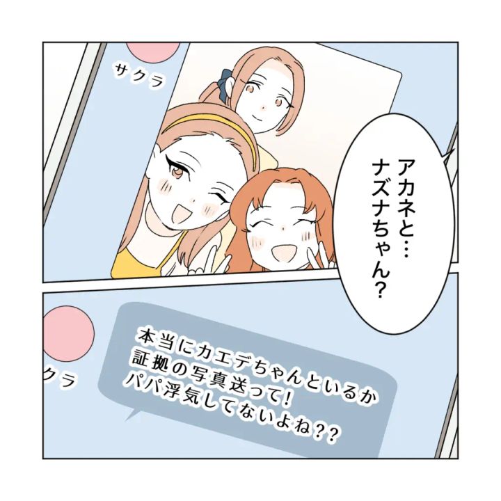 それは妻サクラのスマホでメッセージと画像を送ってきた娘ナズナからでした。サクラ、ナズナ、アカネが楽しそうに写真に写っています。そして『本当にカエデちゃんといるか証拠の写真送って!パパ浮気してないよね??』というかわいいメッセージ。