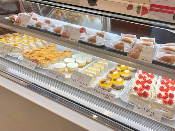レジ横のショーケースには生菓子が整列。ブッセは1個240円、ケーキは1個260円から購入でき、良心的なお値段に思わず瞬きしてしまいます。