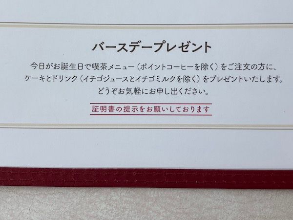 お誕生日当日に運転免許証やマイナンバーカードなど誕生日が記載された証明書を提示することで、対象のケーキとドリンクを無料でいただくことができます◎