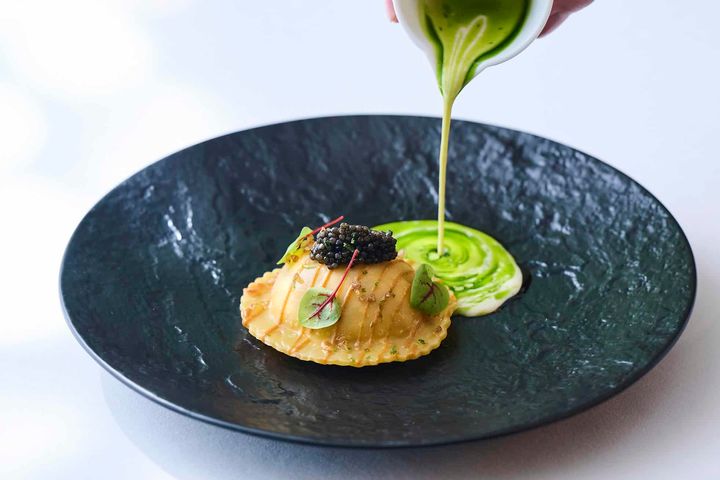 ラングスティーヌと白いんげん豆のラヴィオリ ソースノイリー "カルヴィシウス社"のオシェトラキャヴィア添え(ディナーコース)