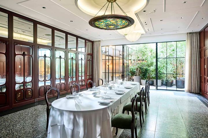 メインダイニングは、フランス・リヨンにある世界的名店「レストラン ポール・ボキューズ」の気品を継承しつつ、象徴的なアール・ヌーヴォー建築の意匠はそのままに、上質でコンテンポラリーな空間へとブラッシュアップ。床には木片を巧みに組み合わせた幾何学模様が美しいフランスの伝統的技法「パーケットフローリング」を採用し、フレンチクラシックの優雅で上質な雰囲気を醸しています。