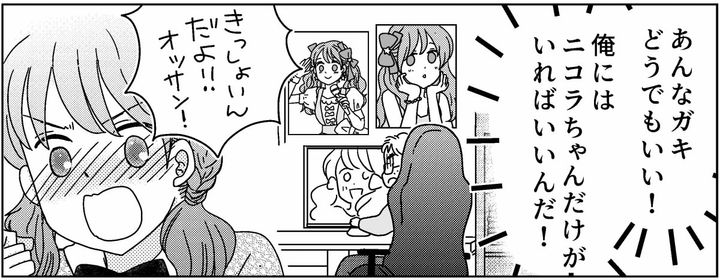俺は部屋で1人、推しのアイドル・ニコラちゃんのライブ映像を見ていた。見れば見るほどうっとりしてしまう。そんなとき母がツバサの制服姿の写真を見せてきた。ユウタ一家が来ているときはいつも自分の部屋にいたし、まさか姪っ子がこんな成長を遂げているなんて驚いた。ニコラちゃんによく似ているじゃないか!