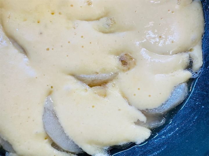 6. 混ぜた生地を4のフライパンに流しいれ、フタをして弱火で12~18分焼く。