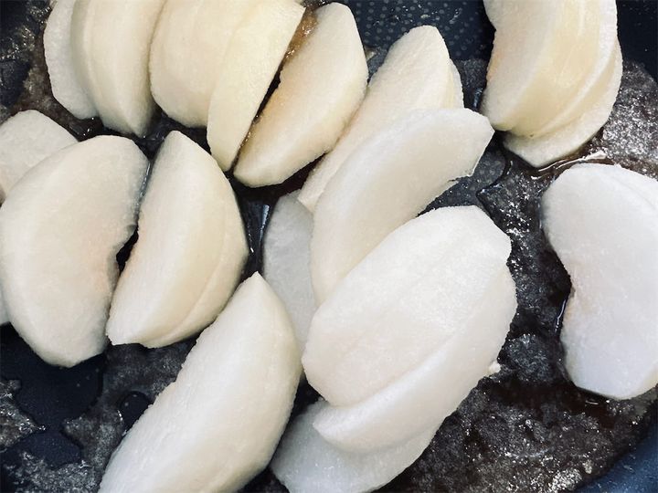 4. 別のフライパンの表面にバターをひと塗りしてから、3の梨を放射状に並べる。