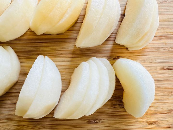 1. 梨は皮を剥き、1〜2cm幅のくし切りにする。