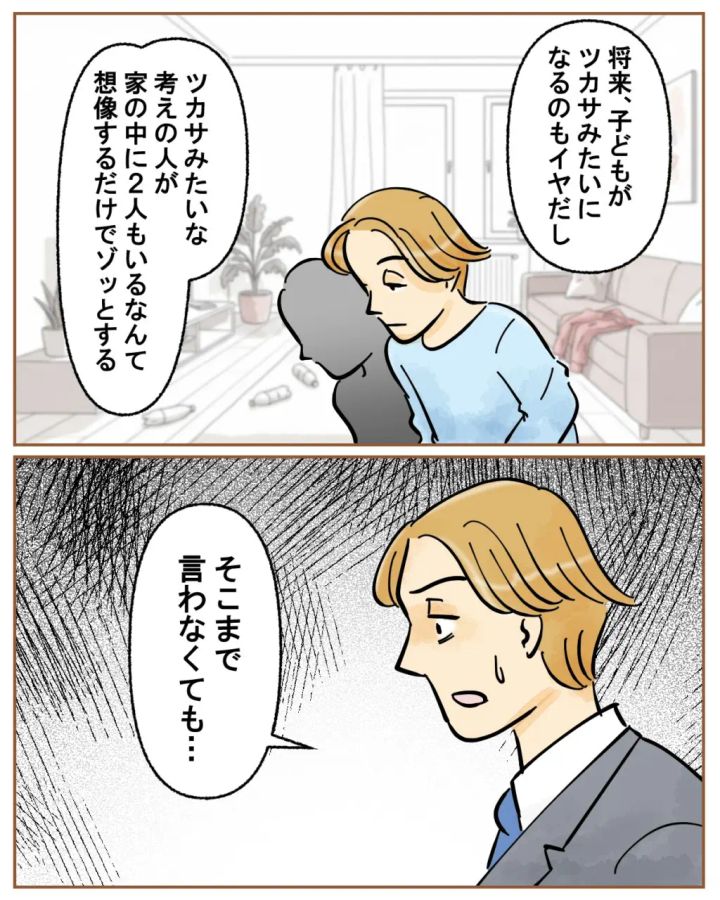 「将来、子どもがツカサみたいになるのもイヤだし、ツカサみたいな考えの人が家の中に2人もいるなんて、想像するだけでゾッとする」と言うと、「そこまで言わなくても・・」と呆然とするツカサに、