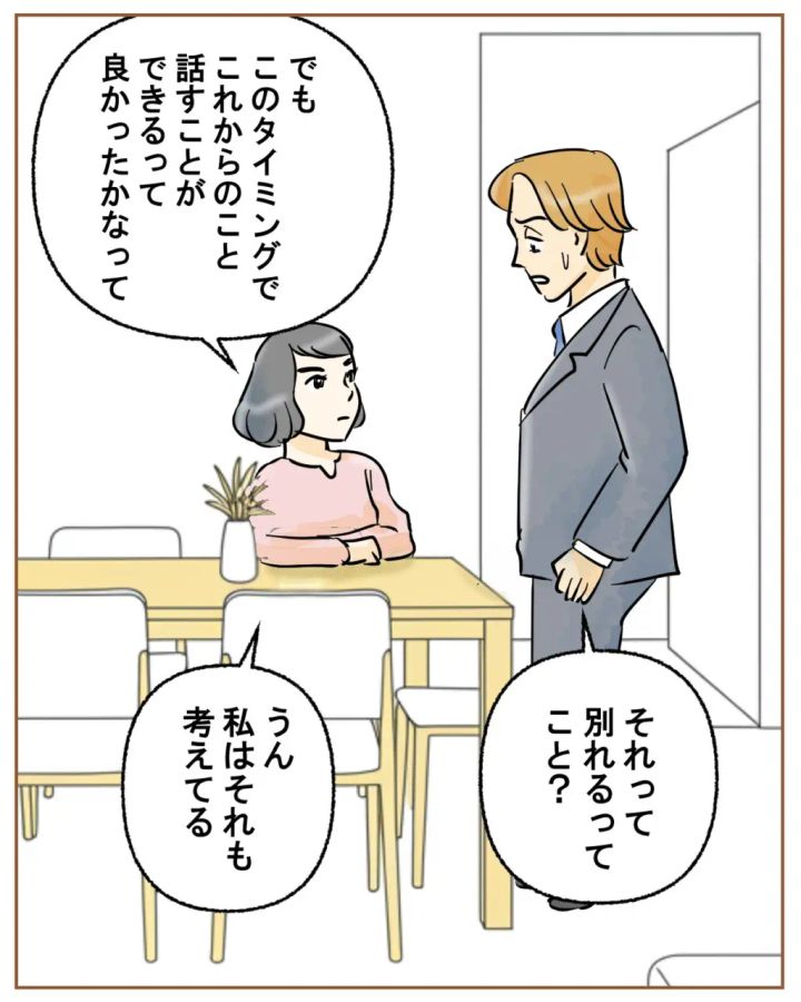 「でも、このタイミングでこれからのこと話すことができるって良かったかなって」と切り出すと、「それって別れるってこと?」ツカサの言葉に、「うん。私はそれも考えてる」と言った後、